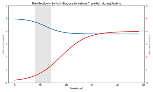 • חלון ה-"Switch": האזור המוצלל בגרף (בין השעה 8 ל-14) מייצג את החלון הקריטי שבו הגוף מבצע את המעבר המטבולי העיקרי – מפירוק גלוקוז לחמצון שומן ויצירת קטונים.