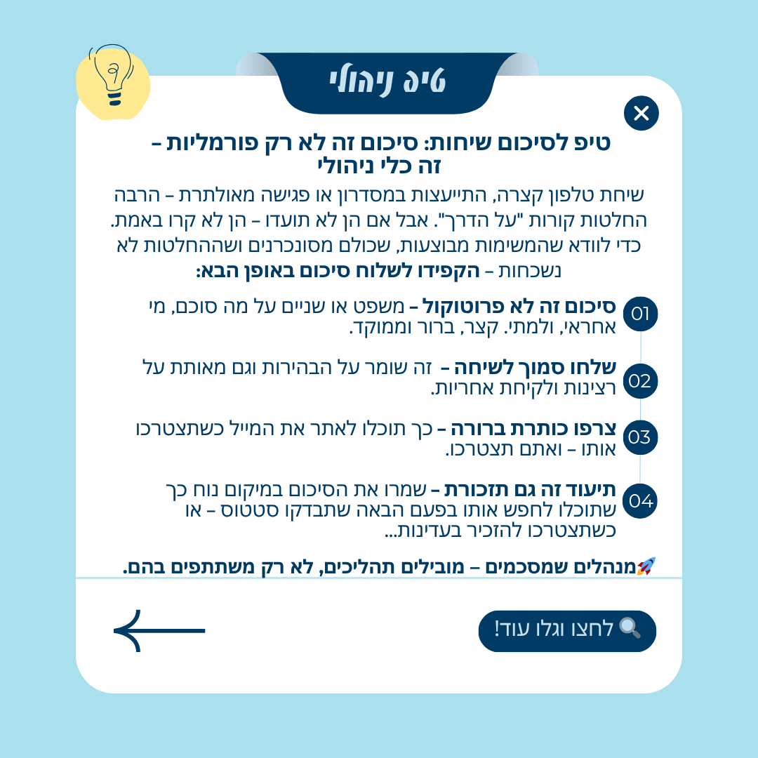 טיפ מספר 5 - טיפ לסיכום שיחות: סיכום זה לא רק פורמליות - זה כלי ניהולי