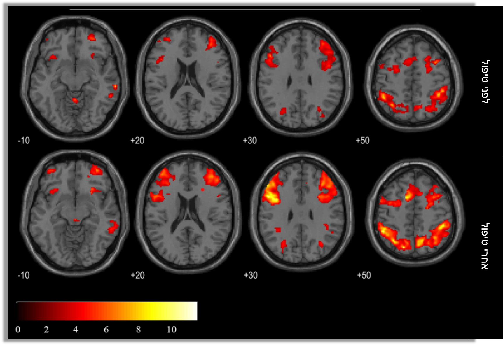 Functional MRI המדגים פעילות מוחית בעת ביצוע מטלה לפני ואחרי טיפול בתא לחץ.