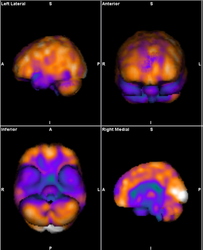בהדמיה תפקודית של רקמת המוח אזורים תפקודיים מודגמים בצבעים בהירים ואילו אזורים בעלי תפקוד נמוך מודגמים בצבעים קרים. בהדמיה זו מודגמת תת פעילות של קדמת המוח (PFC) ושל אזורים טמפורליים בתמונה המאפיינת מטופלים עם PTSD.