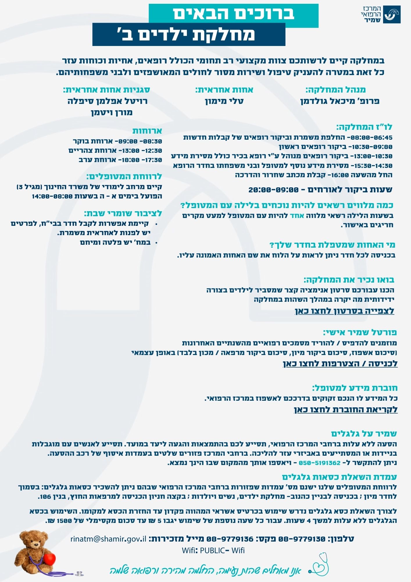 היחידה לאשפוז יום ומרפאות ילדים במרכז הרפואי, מרכזת את השירות האמבולטורי של חטיבת הילדים ומטפלת מדי שנה בלמעלה מ-12,000 ילדים.
