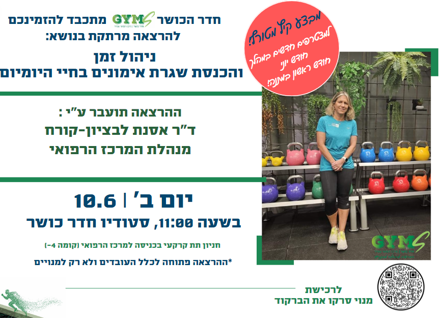 הרצאה של פרופ' אסנת לב ציון קורח בנושא ניהול זמן והכנסת שגרת אימונים בחיי היומיום- חדר כושר